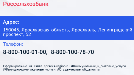 Россельхозбанк по адресу 150045, Ярославская область, Ярославль, Ленинградский проспект, 52 в дальнейшем Организация, размещена в следующих категориях: