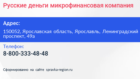 Русские деньги, микрофинансовая компания по адресу 150052, Ярославская область, Ярославль, Ленинградский проспект, 49а в дальнейшем Организация, размещена в следующих категориях: