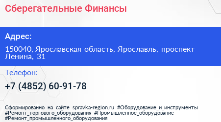 Сберегательные Финансы по адресу 150040, Ярославская область, Ярославль, проспект Ленина, 31 в дальнейшем Организация, размещена в следующих категориях: