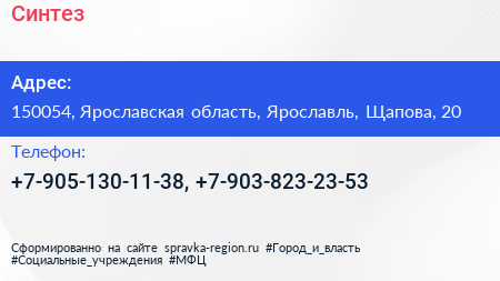 Синтез по адресу 150054, Ярославская область, Ярославль, Щапова, 20 в дальнейшем Организация, размещена в следующих категориях: