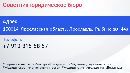 Советник, юридическое бюро по адресу 150014, Ярославская область, Ярославль, Рыбинская, 44а в дальнейшем Организация, размещена в следующих категориях: