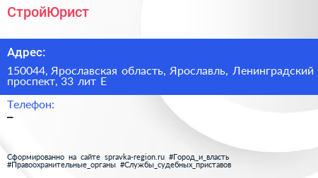 СтройЮрист по адресу 150044, Ярославская область, Ярославль, Ленинградский проспект, 33 лит Е в дальнейшем Организация, размещена в следующих категориях: