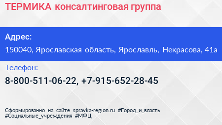 ТЕРМИКА, консалтинговая группа по адресу 150040, Ярославская область, Ярославль, Некрасова, 41а в дальнейшем Организация, размещена в следующих категориях: