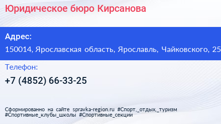 Юридическое бюро Кирсанова по адресу 150014, Ярославская область, Ярославль, Чайковского, 25 в дальнейшем Организация, размещена в следующих категориях: