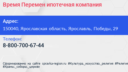 Время Перемен, ипотечная компания по адресу 150040, Ярославская область, Ярославль, Победы, 29 в дальнейшем Организация, размещена в следующих категориях: