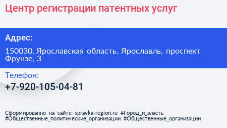 Центр регистрации патентных услуг по адресу 150030, Ярославская область, Ярославль, проспект Фрунзе, 3 в дальнейшем Организация, размещена в следующих категориях: