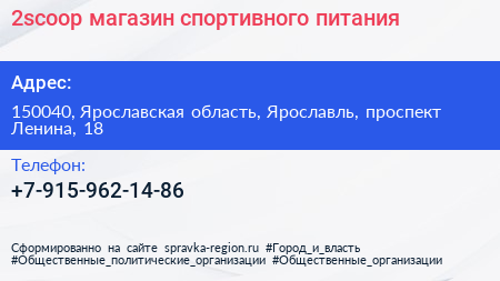 2scoop, магазин спортивного питания по адресу 150040, Ярославская область, Ярославль, проспект Ленина, 18 в дальнейшем Организация, размещена в следующих категориях: