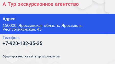 А-Тур, экскурсионное агентство по адресу 150000, Ярославская область, Ярославль, Республиканская, 45 в дальнейшем Организация, размещена в следующих категориях: