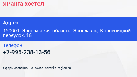 ЯРанга, хостел по адресу 150001, Ярославская область, Ярославль, Коровницкий переулок, 18 в дальнейшем Организация, размещена в следующих категориях: