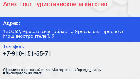 Anex Tour, туристическое агентство по адресу 150062, Ярославская область, Ярославль, проспект Машиностроителей, 9 в дальнейшем Организация, размещена в следующих категориях: