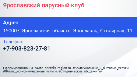 Ярославский парусный клуб по адресу 150007, Ярославская область, Ярославль, Столярная, 11 в дальнейшем Организация, размещена в следующих категориях: