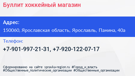 Буллит, хоккейный магазин по адресу 150060, Ярославская область, Ярославль, Панина, 40а в дальнейшем Организация, размещена в следующих категориях: