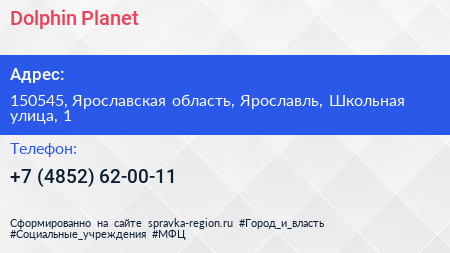 Dolphin Planet по адресу 150545, Ярославская область, Ярославль, Школьная улица, 1 в дальнейшем Организация, размещена в следующих категориях: