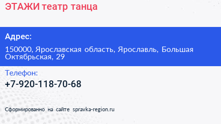 ЭТАЖИ, театр танца по адресу 150000, Ярославская область, Ярославль, Большая Октябрьская, 29 в дальнейшем Организация, размещена в следующих категориях: