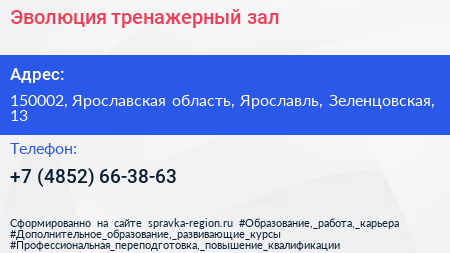 Эволюция, тренажерный зал по адресу 150002, Ярославская область, Ярославль, Зеленцовская, 13 в дальнейшем Организация, размещена в следующих категориях: