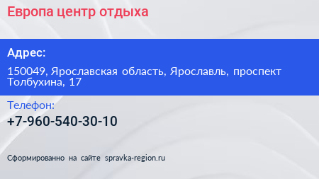 Европа, центр отдыха по адресу 150049, Ярославская область, Ярославль, проспект Толбухина, 17 в дальнейшем Организация, размещена в следующих категориях: