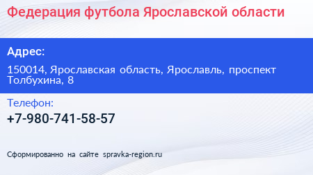 Федерация футбола Ярославской области по адресу 150014, Ярославская область, Ярославль, проспект Толбухина, 8 в дальнейшем Организация, размещена в следующих категориях:
