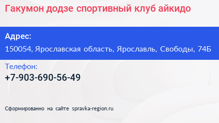 Гакумон додзе, спортивный клуб айкидо по адресу 150054, Ярославская область, Ярославль, Свободы, 74Б в дальнейшем Организация, размещена в следующих категориях: