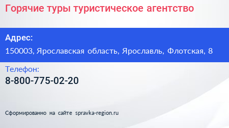 Горячие туры, туристическое агентство по адресу 150003, Ярославская область, Ярославль, Флотская, 8 в дальнейшем Организация, размещена в следующих категориях:
