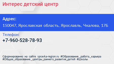 Интерес, детский центр по адресу 150047, Ярославская область, Ярославль, Чкалова, 17Б в дальнейшем Организация, размещена в следующих категориях: