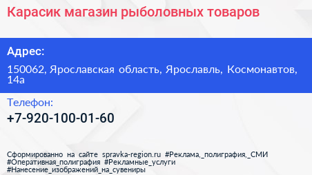 Карасик, магазин рыболовных товаров по адресу 150062, Ярославская область, Ярославль, Космонавтов, 14а в дальнейшем Организация, размещена в следующих категориях: