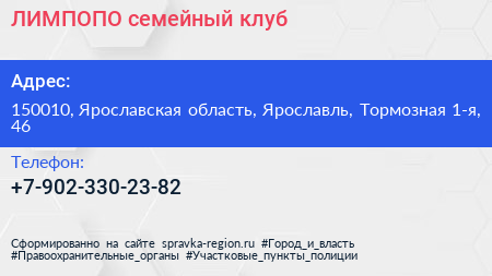 ЛИМПОПО, семейный клуб по адресу 150010, Ярославская область, Ярославль, Тормозная 1-я, 46 в дальнейшем Организация, размещена в следующих категориях: