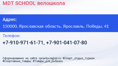 MDT SCHOOL, велошкола по адресу 150000, Ярославская область, Ярославль, Победы, 41 в дальнейшем Организация, размещена в следующих категориях: