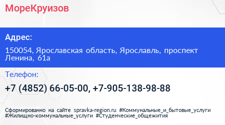 МореКруизов по адресу 150054, Ярославская область, Ярославль, проспект Ленина, 61а в дальнейшем Организация, размещена в следующих категориях:
