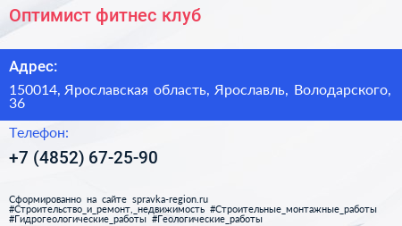 Оптимист, фитнес-клуб по адресу 150014, Ярославская область, Ярославль, Володарского, 36 в дальнейшем Организация, размещена в следующих категориях: