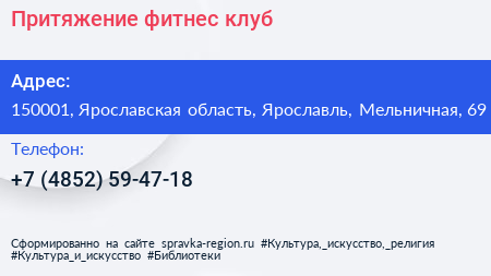 Притяжение, фитнес-клуб по адресу 150001, Ярославская область, Ярославль, Мельничная, 69 в дальнейшем Организация, размещена в следующих категориях: