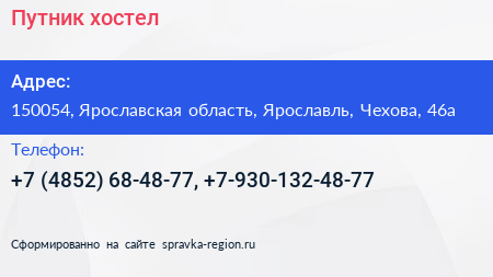 Путник, хостел по адресу 150054, Ярославская область, Ярославль, Чехова, 46а в дальнейшем Организация, размещена в следующих категориях:
