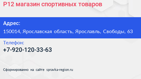 Р12, магазин спортивных товаров по адресу 150014, Ярославская область, Ярославль, Свободы, 63 в дальнейшем Организация, размещена в следующих категориях: