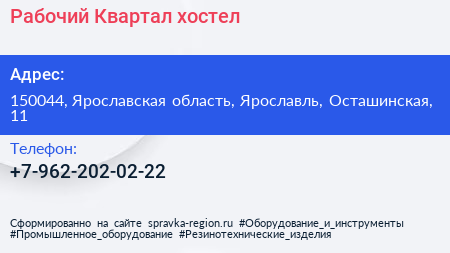 Рабочий Квартал, хостел по адресу 150044, Ярославская область, Ярославль, Осташинская, 11 в дальнейшем Организация, размещена в следующих категориях: