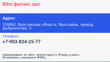 Ritm, фитнес-зал по адресу 150062, Ярославская область, Ярославль, проезд Доброхотова, 3 в дальнейшем Организация, размещена в следующих категориях: