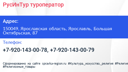 РусИнТур, туроператор по адресу 150049, Ярославская область, Ярославль, Большая Октябрьская, 87 в дальнейшем Организация, размещена в следующих категориях: