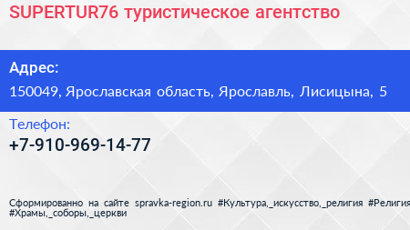 SUPERTUR76, туристическое агентство по адресу 150049, Ярославская область, Ярославль, Лисицына, 5 в дальнейшем Организация, размещена в следующих категориях: