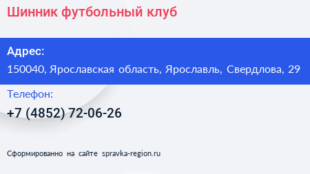 Шинник, футбольный клуб по адресу 150040, Ярославская область, Ярославль, Свердлова, 29 в дальнейшем Организация, размещена в следующих категориях: