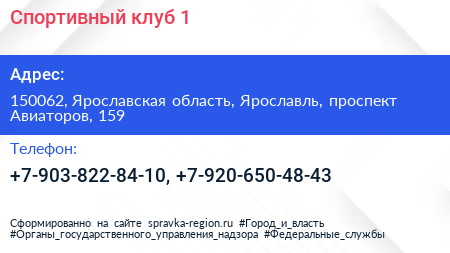 Спортивный клуб №1 по адресу 150062, Ярославская область, Ярославль, проспект Авиаторов, 159 в дальнейшем Организация, размещена в следующих категориях: