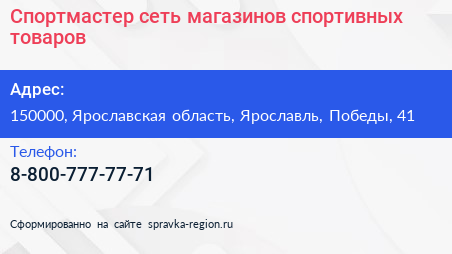 Спортмастер, сеть магазинов спортивных товаров по адресу 150000, Ярославская область, Ярославль, Победы, 41 в дальнейшем Организация, размещена в следующих категориях: