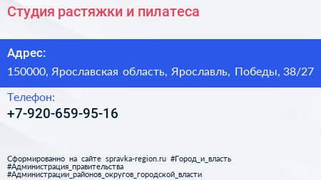 Студия растяжки и пилатеса по адресу 150000, Ярославская область, Ярославль, Победы, 38/27 в дальнейшем Организация, размещена в следующих категориях: