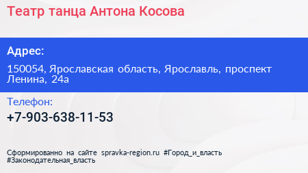 Театр танца Антона Косова по адресу 150054, Ярославская область, Ярославль, проспект Ленина, 24а в дальнейшем Организация, размещена в следующих категориях: