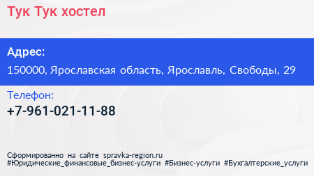 Тук-Тук, хостел по адресу 150000, Ярославская область, Ярославль, Свободы, 29 в дальнейшем Организация, размещена в следующих категориях: