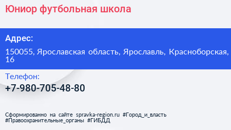 Юниор, футбольная школа по адресу 150055, Ярославская область, Ярославль, Красноборская, 16 в дальнейшем Организация, размещена в следующих категориях: