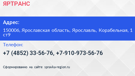 ЯРТРАНС по адресу 150006, Ярославская область, Ярославль, Корабельная, 1 ст9 в дальнейшем Организация, размещена в следующих категориях: