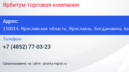Ярбитум, торговая компания по адресу 150014, Ярославская область, Ярославль, Богдановича, 6а в дальнейшем Организация, размещена в следующих категориях: