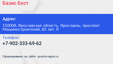 Базис Бест по адресу 150008, Ярославская область, Ярославль, проспект Машиностроителей, 83 лит Л в дальнейшем Организация, размещена в следующих категориях: