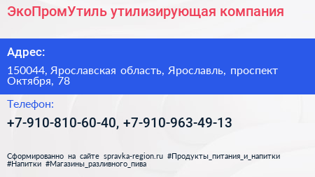 ЭкоПромУтиль, утилизирующая компания по адресу 150044, Ярославская область, Ярославль, проспект Октября, 78 в дальнейшем Организация, размещена в следующих категориях:
