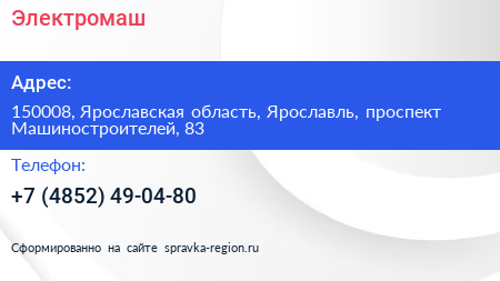 Электромаш по адресу 150008, Ярославская область, Ярославль, проспект Машиностроителей, 83 в дальнейшем Организация, размещена в следующих категориях: