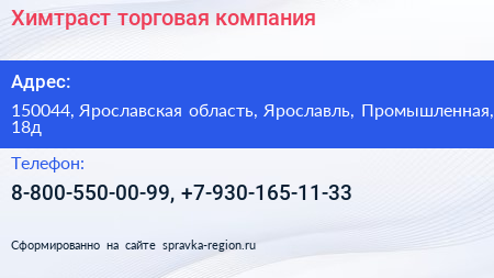 Химтраст, торговая компания по адресу 150044, Ярославская область, Ярославль, Промышленная, 18д в дальнейшем Организация, размещена в следующих категориях: