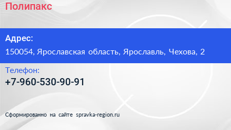 Полипакс по адресу 150054, Ярославская область, Ярославль, Чехова, 2 в дальнейшем Организация, размещена в следующих категориях: